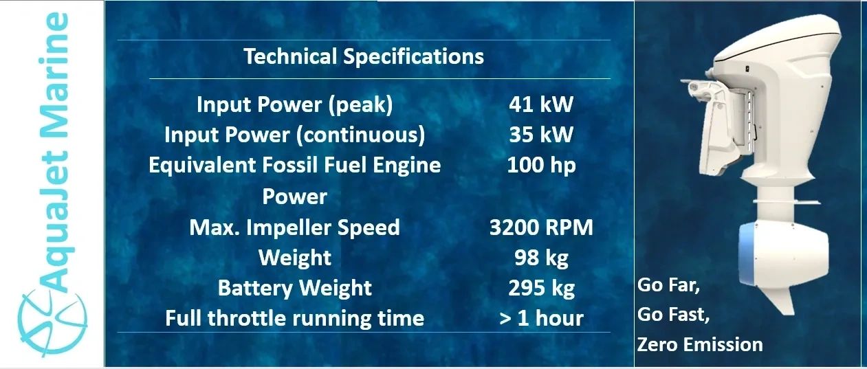 AquaJet revolutionizes electric outboard technology with its patented suspended rotor and high-momentum waterjet nozzle, converting battery energy into thrust with minimal losses. Unlike traditional electric outboards that struggle with range, power, and efficiency, AquaJet delivers at least 30% longer range.